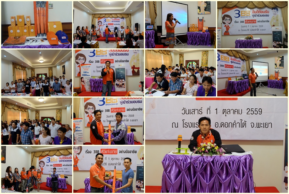 เมื่อเสาร์ที่ 1 ตุลาคม 2559 3BB จังหวัดพะเยา จัดกิจกรรมอบรมตัวแทนขาย 3BB ขึ้นที่ โรงแรมวีซี อ.ดอกคำใต้ จ.พะเยา โดยคุณเอกมล อุ่ยสันติวงศ์ ผู้จัดการ Cluster เชียงราย และคุณยุทธภูมิ อินทยศ ผู้จัดการจังหวัด วิทยากรประกอบด้วย คุณยุทธภูมิ อินทยศ ตำแหน่งผู้จัดการจังหวัดพะเยา ได้ให้ความรู้เกี่ยวกับโครงข่าย 3BB และความรู้ในเชิงเทคนิคของเทคโนโลยี ADSL ,VDSL และ FTTx ,คุณสร้อยมาลี สุขเสริญ ตำแหน่งเจ้าหน้าที่บริหารงานขายอาวุโส ให้ความรู้เกี่ยวกับ ผลิตภัณฑ์และบริการเสริมและคุณอรุณี ศุภวาร ตำแหน่งเจ้าหน้าที่บริหารงานขายอาวุโส ให้ความรู้เกี่ยวกับ กระบวนการและเทคนิคการขาย สำหรับตัวแทนขาย โดยมีตัวแทนทุกอำเภอ เข้าร่วมอบรมจำนวนมากในงาน มีกิจกรรรมจับมือร้องเพลงร่วมกับตัวแทนขาย ,ทำสไลต์เพลงรวบรวมภาพกิจกรรมต่างๆ ของตัวแทน, ตอบคำถามรับของรางวัล จับสลากของรางวัลมากมาย และท้ายสุด มีการมอบรางวัลให้แก่ตัวแทนขายที่มียอดขายสูงสุด, ตัวแทนขายที่มียอดขายสม่ำเสมอ และตัวแทนขายน้องใหม่ไฟแรง ก่อนจะร่วมถ่ายภาพเป็นที่ระลึก ทำให้บรรยากาศภายในงาน เต็มไปด้วยความสนุกและตื่นเต้น เร้าใจ